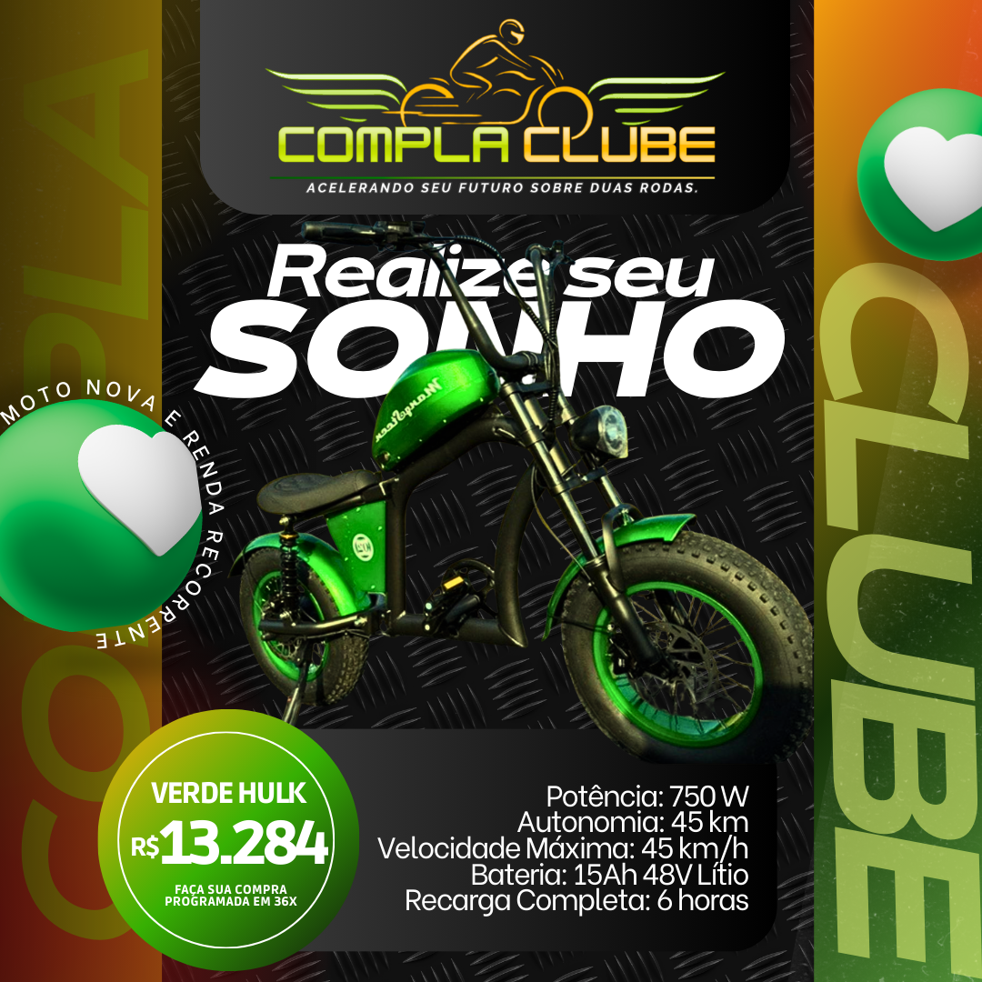 Palavras-chave: EcoMoto, COMPLA CLUBE, moto elétrica, Verde Hulk, 750W, autonomia 45 km, velocidade 45 km/h, bateria de lítio, recarga rápida, sustentável, mobilidade elétrica, transporte ecológico, baixo custo de manutenção, silenciosa, estilo chopper, compra progr